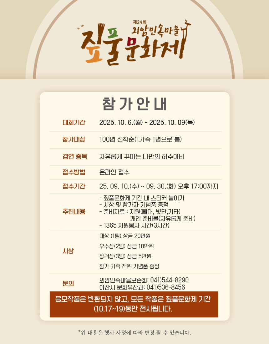※ 응모작품은 반환되지 않고, 모든 작품은 짚풀문화제 기간(10.17~19)동안 전시됩니다. - 시상